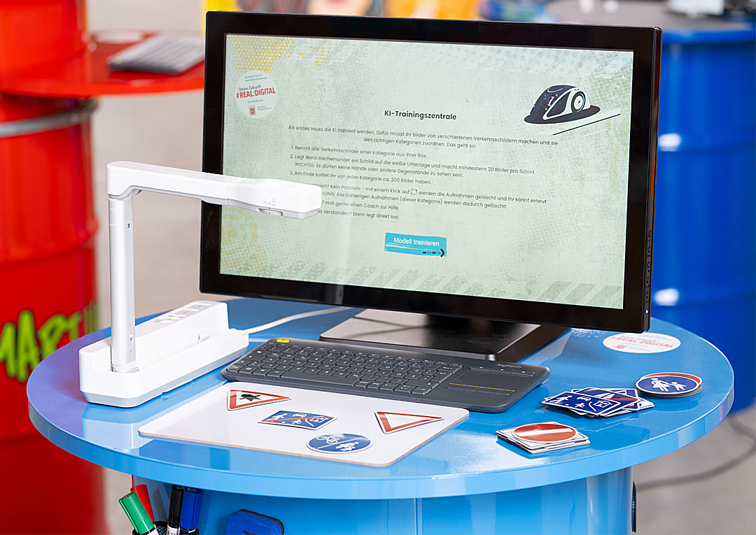 Training ist alles: Damit Maschinen ähnlich intelligent wie Menschen handeln – also beispielsweise Dinge erkennen und zuordnen können – muss man sie vorher „schlau machen“, d.h. mit Daten füttern. An dieser Erlebnisstation trainieren die Schülerinnen und Schüler eine künstliche Intelligenz, unterschiedliche Verkehrsschilder voneinander zu unterscheiden. Aber KI ist nicht nur für das autonome Fahren wichtig, sondern eine zentrale Zukunftstechnologie. Wie sie unterschiedliche Berufe verändert, erfahren die Jugendlichen im berufsorientierenden Teil der Aufgabe.